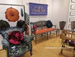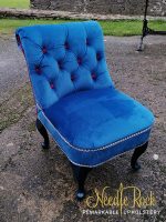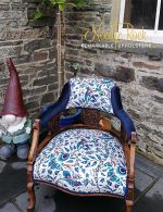 A modern new look for this chair with navy glistening fabric, to fit in with the new kitchen, and rubbed down woodwork.